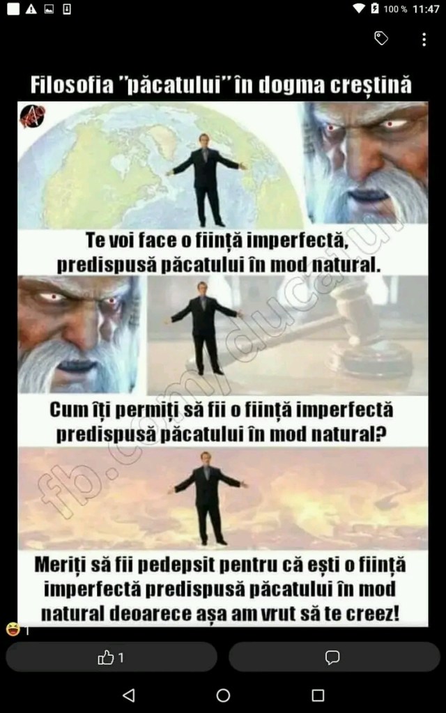 Pentru cine e ‘credincios profund’ (adică…’adevăratul credincios’!- ăsta fiind un motiv pentru care, cum zice Apocalipsa, se vor mai filtra odată,chiar și sfinții!: ca să nu mai pățească Dumnezeu așa cum a pățit mereu!: la Potop; la Sodoma; la Vițelul de aur- devenit idol de închinare al evreilor fugiți din Egipt!- etc!), această întrebare (eventual dubiu!) nici nu există! Căci ei vor fi doar în situația menționată de Pavel!: ‘sunt liber să fac orice,dar nu orice îmi este de folos’! Pentru că,odată ce posezi ‘drogul spiritual care te duce în rai’…nimic altceva nu mai contează!- și nici nu îți mai poate furniza,eventual,o plăcere! Toată gândirea îți este afectată! (limitată). Astfel,din toate posibilitățile oferite de materie,tu…(credinciosule fidel!)…nu vei mai putea alege „plăcerea adevărată”! (evolutivă). Ci vei ‘simți’ mereu o ‘dorință irepresibilă’ de a merge…’tot mai adânc!- mereu mai adânc’! (spre ‘esența pură’!). Când vezi doi indivizi care fac sex (deci…cu „posibilitatea reală” a înmulțirii!), ‘reacția ta comandată de sus’ (sub minciuna ‘libertății de alegere’!) va fi una de…’respingere și dezgust’! (ce dacă,prin asta,nu se mai respecta nici măcar porunca din rai?!- ‘creșteți și înmulțiți-vă’!). Oricum Dumnezeu nu a vrut asta de la început!- de aceea Adam fiind creat…singur! (nu se știe nici dacă nu cumva i-a făcut testiculele mai târziu,după ce a creat-o pe Eva!). Deci, a fost oarecum o decizie…forțată de Adam!- ceea ce deja nu era bine! Dar cu totul…’altceva’ era ‘cazul’ când omul observa…ceva violent! Imediat se simțea…’mândru!- îndemnat la fapte eroice’! Nici măcar apariția primară a doi frați care se și certau în preajma ‘Creației’ (Abel și Cain!: când ultimul l-a ucis pe primul deoarece…’jertfa lui de carne i-a plăcut mai mult lui Dumnezeu’!- care era,probabil…carnivor, ca o Fiară!), nu era în măsură să îl îngrijoreze pe proaspătul credincios! Până în zilele noastre deci…’eroismul și iubirea de țară’ se manifestă prin…’jertfe de sânge’! Așa au făcut creștinii timp de mii de ani!- și la fel fac acum islamiștii, care luptă contra Israelului! (a nu se uita nici cum au ajuns evreii să stăpânească acele teritorii!: ‘conduși de Dumnezeu spre Țara făgăduită’, chiar dacă acolo exista deja o populație!; dar au cucerit-o până la urmă,cu ajutor de la Dumnezeu!: după ce au căzut…zidurile Ierihonului!). Deci…asta e!: avem de-a face,oricum,cu o Istorie…’infestată de divinitate’! (cu ‘semne de sânge’, puse de Dumnezeu pe fruntea lui Cain!). Degeaba vor ‘unii’ să ascundă asta!- spunând,de exemplu,că palestinienii sunt preocupați doar de un mare rezervor de gaze și petrol,aflat sub mareadin fața fâșiei Gaza! Un ‘terorist’ (pentru creștini!- căci la ai lui era considerat ‘luptător erou’!) se lăuda deci că a ucis zece evrei!- și era tare mândru, lăudându-se la tatăl lui!; sau,în mari adunări publice din Egipt,ale palestinienilor,se striga că sunt gata să își verse sângele!- căci…’Dumnezeu/Allah e mare’! etc.