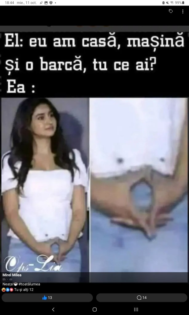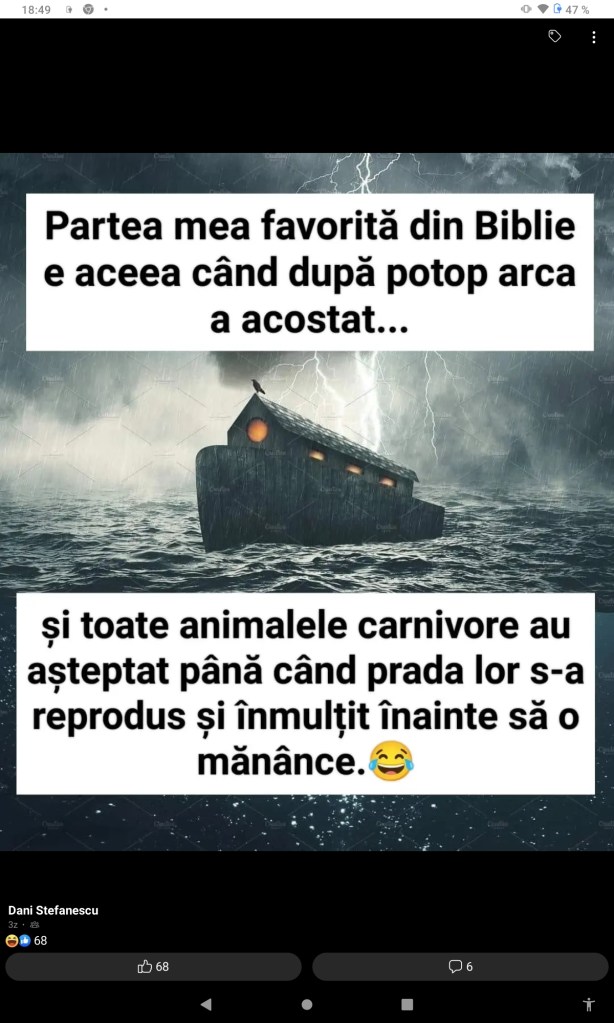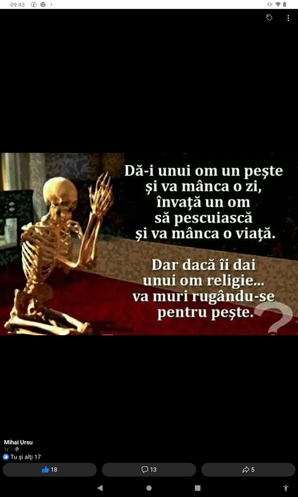 În primul rând,acești ‘iluminați’ au,fiecare, ‘îngâmfarea credinței’ că ‘doar ei au dreptate’! De aceea atacă ‘plini de furie’ (!) pe acei eventuali locuitori ai „insulei evolutive” pentru simplul motiv că voiau și ei „un loc al lor”! (ceea ce ‘spiritul totalitar’ nu îngăduie!). Orice „sfat” care venea de la „aceștia” era ‘întâmpinat’ cu o ‘atitudine agresivă’!: trebuind imediat ‘contracarat’, ca venind ‘de la diavoli’! Iar dacă unele vedete pledau pentru…omenie (!)- și salvarea civililor din Gaza!- atunci era suficient’ să existe o singură vedetă care să afirme direct asta,că…’toate vedetele erau contra Israelului’! (Realitatea Plus/16.10.2023). Cam ‘ăsta’ era ‘cadrul general’…care se vedea apoi în luările de cuvânt! Cu toate astea…se ‘pleda’ pentru ‘credința profundă’!: în care ‘trebuia să te hrănești cu sângele și trupul lui Hristos’! Atunci, cum să mai accepți…’să îți amesteci sângele’ cu alt sânge?! (al altor ‘credințe’!: musulman etc). De aceea apăreau o mulțime de ‘păreri pro și contra’ ale ‘credincioșilor’!- dar fără a fi totuși…’fanatici și extremiști’! Cineva (V. Pricină) relua vechile idei conform cărora cultura era întemeiată pe religie! Altul era de părere că Europa greșise!- când a permis pătrunderea islamiștilor în Europa! (ceea ce i-a distrus baza creștină!). Deci…’fără Europa’! (zicea și Mugur Mihăescu)- cu toate că ea pleda pentru dreptatea lui Israel! Un Israel care,însă,ataca în forță pe toți palestinienii! (dar fără a fi ‘totalitar’!). Anca (Alexandrescu) nu voia însă,în ruptul capului,să introducă motivul religios în conflictul din Orientul Mijlociu! (‘normal’!- păi altfel cum?!). Dar se ‘revolta’ aflând că în Germania (care acceptase mulți emigranți musulmani!) se decretase (într-o localitate mică) să se interzică bradul de Crăciun! (ca să nu fie rănite sentimentele musulmane!). Concluzia?!- să se ia ca exemplu…’civilizația musulmană’!- care…’uite că înflorea’! (spre deosebire de Europa!- care cădea în decrepitudine!: fiindcă admitea aberațiile LGBT!- iar lumea nu mai mergea la biserică!). Deci…ce-i lipsea Europei?! Ne ‘lumina’ teologul Valentin Guia!: rugăciunea ‘Tatăl nostru’! Așa încât,în final,toți o rosteau!- fie murmurând,fie mai deschis! Deci…’păzea’!: acum ‘toți vor ști’ cum să întâmpine musulmanii, la o viitoare cerere de azil! (adică o…’invazie drăcească’!- ce necesita un ‘răspuns pe măsură’!). Când se ataca însăși…’credința’, se putea apela la arme!: după ‘sfințire’, desigur! Și fără probleme!: căci venea Anca Alexandrescu, care spunea că războiul nu avea fundament religios! (cu toate că musulmanii le puneau în față copiilor…poze cu evrei,spunându-li-se că ‘ăia sunt dușmanii și trebuie uciși’!). Dar astea erau…’fapte care nu mai trebuiau cunoscute’! Erau doar…’schelete din dulap’!: deci…ascunse!