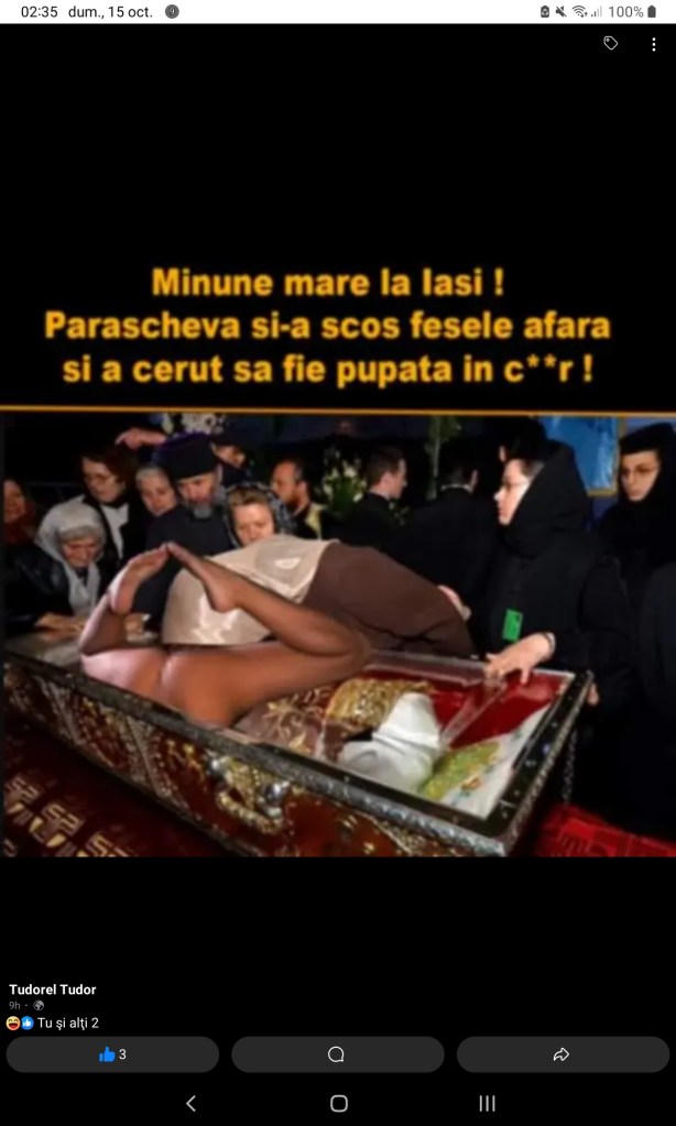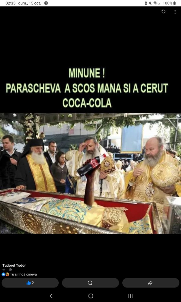 Astfel, azi (la Trinitas TV) preotul (profesor la Teologie!) Gheorghe Holbea ‘făcea lumină’ în ‘credință’! Cică…nu!: trupul nu trebuia lepădat ca un cadavru! (iar astfel se putea profita și de existența moaștelor!- cu banii aferenți…dar tainici!). Între trup și ‘spirit’ se stabileau niște ‘legături’…’tainice’!: existente doar în ‘duhovnicia pură’! (era ‘normal’- pentru ‘credicios’!). Fusese o ‘uniune’!- dar în cer! După ‘păcat’, însă, se destrămase legătura!- și totuși nu! Căci Dumnezeu nu renunțase la om!: și dădea ‘dovezi de înduhovnicire’ prin…’moaște’! (plus veșnicele icoane,anafură și vin etc). Cum știm asta?…Fiindcă la mormânt nu ‘simțim’ că acolo e un cadavru!- ci o…’ființă care mai păstrează un pic de viață’! Dar pe Pământ există un om cu trup și duh separate!- deci…’cum simțea’ acest om că în mormânt există o…’ființă care deja simțise aerul raiului’?! (pe lângă că se mai strecurase o…blasfemie!: se vorbea de o ‘ajungere în rai înainte de Marea Judecată a apocalipsei!). Dar cine este deja ‘hipnotizat’ nu mai e capabil decât să asculte toate cuvintele hipnotizatorului- fără nicio judecată rațională! Pentru el,era deja ‘clar duhovnicește’ (!) că ‘Dumnezeu e în toate’!- și ‘poate să facă orice dorește’! Chiar și că materia poate să facă…’magie’! (păi da!- era mai important să fie atacată materia, prin magie!- decât să se gândească logic). Pentru că credința creștină nu era magie! (adică…materială!?)- ci ‘percepția clară’ că în fața ta este o…’ființă vie’! (chiar dacă era moartă!). Brr!- bu-hu-huu! În fine,ca să nu pară ceva ‘înfricoșător’, toate aceste ‘percepții de viață’ veneau ‘de la Dumnezeu’! Era ‘clar’?! Deci, gata!- să nu se mai atingă batistele…de moaște! (pentru un…’succes pe Pământ’!)- fiindcă era tot magie! Să se ia ‘doar’ (!) obiectele de cult… ‘sfințite’! (evident, pentru bani!). Din nou, nu mai conta ce spunea Biblia!- că o femeie se vindecase prin simpla atingere de hainele lui Isus! Da,dar era o…’materie deja înduhovnicită autentic în rai’!- ceea ce moaștele…poate că nu erau! (servind doar lui Mamona!: adică banii!). Încă mai trebuia (!) ca ‘Dumnezeu să experimenteze pe om, prin durere’!- numai pentru a ‘repara materia stricată de păcatul neascultării’! Încet,încet…trupul era ‘antrenat pentru rai’!- până la…completa lui dispariție pământească și reconstrucția în rai’!: adică…tot o ‘păstrare a trupului’!? Sau,un ‘vlăstar al viței de vie divine’!- de după ‘înghițirea de către Gura Apocalipsei’!